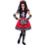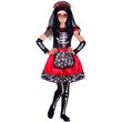 8/10 ans (128 à 140 cm) - Contenu : 1 robe, 1 paire de manchettes, 1 serre-tête avec voile.Ce déguisement se compose d'une robe rouge et noire sans manches. Le jupon de la robe est rouge satiné. Il y a un effet de tablier avec des dessins de calaveras colorés. On retrouve le même motif sur le bas de