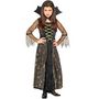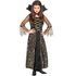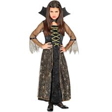 5/7 ans (110 à 122 cm) - Contenu : 1 robe, 1 collier. Le déguisement se compose d'une longue robe noire effet velours. Le bustier de la robe à un effet corsage doré. Il y a un tissu transparent avec des toiles d'araignée dorées sur le jupon. Les manches longues sont évasées et sont dans le même tiss