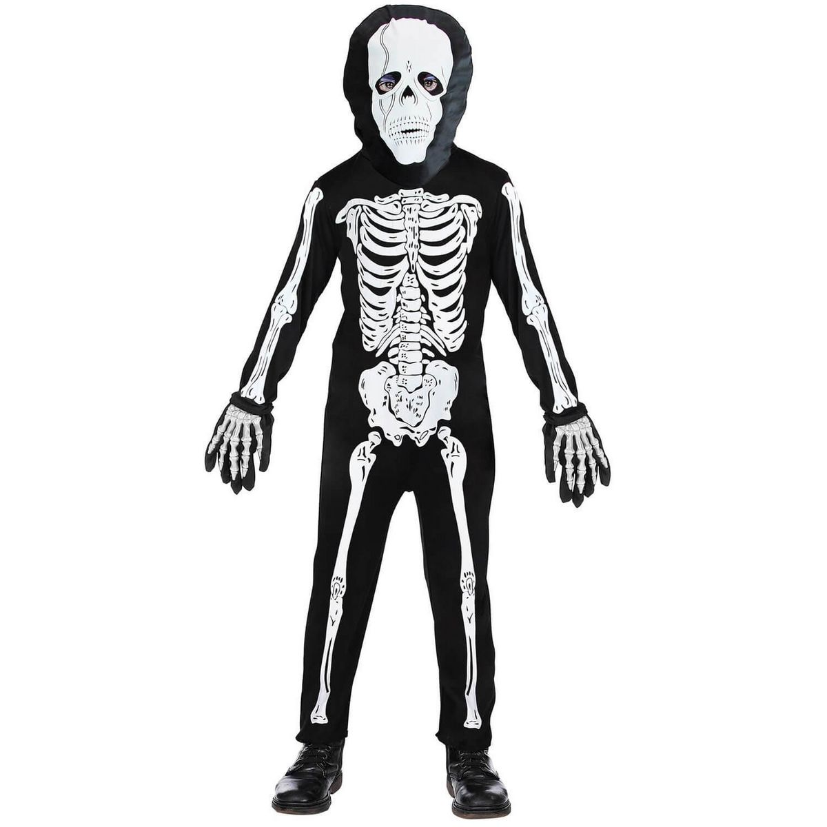 11/13 ans (145 à 158 cm) - Contenu : 1 costume et 1 masque.Ce déguisement possède une combinaison entièrement noire avec un dessin de squelette blanc. La combinaison de comporte pas les pieds. Un masque noir avec un crâne de squelette blanc vient compléter le déguisement. Le masque est en tissu et s'enfile sur la tête. Il y a deux trous pour les yeux. Age minimum : la naissance
