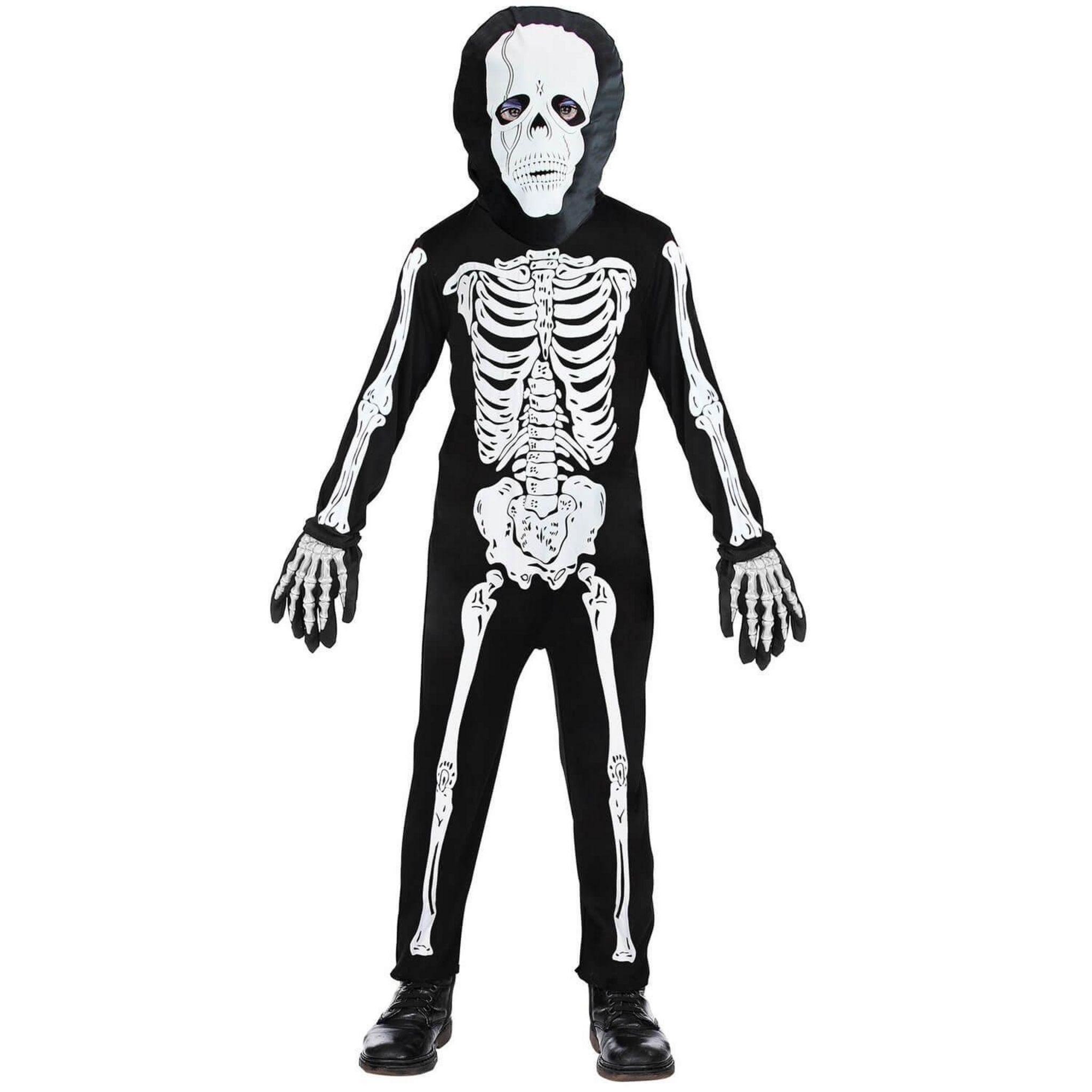 2/3 ans (86 à 96 cm) - Contenu : 1 costume et 1 masque.Ce déguisement possède une combinaison entièrement noire avec un dessin de squelette blanc. La combinaison de comporte pas les pieds. Un masque noir avec un crâne de squelette blanc vient compléter le déguisement. Le masque est en tissu et s'enf