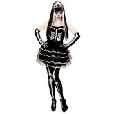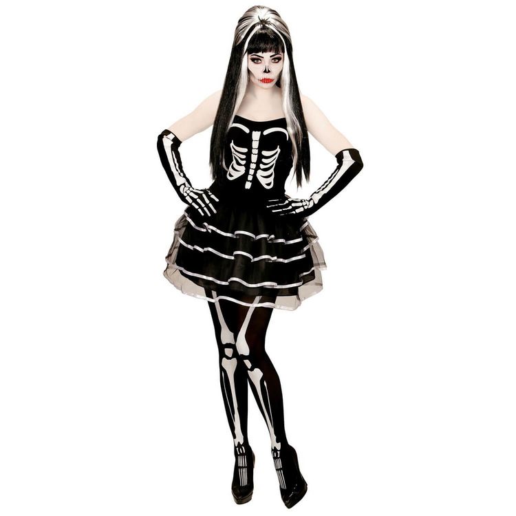 S - 36/38 - Contenu : 1 robe et 1 paire de gants.Ce déguisement se compose d'une robe noire à bretelles. Il y a un dessin de squelette blanc sur le buste. Le jupon est noir avec plusieurs niveaux de volants. Il y a une fine bande blanche sur le bas de chaque volant. La robe est courte. Elle vient av