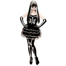 S - 36/38 - Contenu : 1 robe et 1 paire de gants.Ce déguisement se compose d'une robe noire à bretelles. Il y a un dessin de squelette blanc sur le buste. Le jupon est noir avec plusieurs niveaux de volants. Il y a une fine bande blanche sur le bas de chaque volant. La robe est courte. Elle vient avec une paire de gants. Les gants sont noirs avec un dessin de squelette blanc qui reprend les os du bras et de la main. Age minimum : la naissance