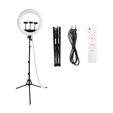 3 supports smartphones, Trépied réglable de 0.8 à 2 m, 3 couleurs de lumière, Diamètre 18 pouces, Télécommande Bluetooth