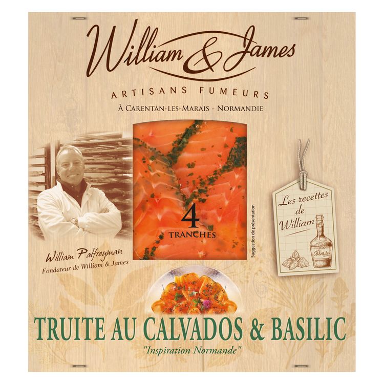 Truite, Sel, Poivre, Sucre, Calvados 2.5%, Basilic 0.7%