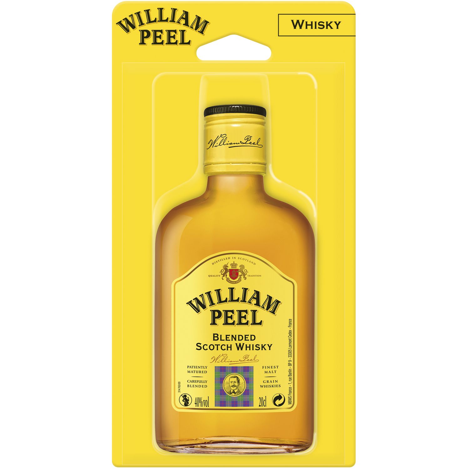 WILLIAM PEEL est un blended Scotch Whisky élaboré dans le respect des traditions écossaises. Vieilli 3 ans en fûts de chêne, il est le fruit d'un assemblage de whiskies de malts et de whiskies de grains soigneusement sélectionnés qui lui donne son caractère unique : rond et parfaitement équilibré.
