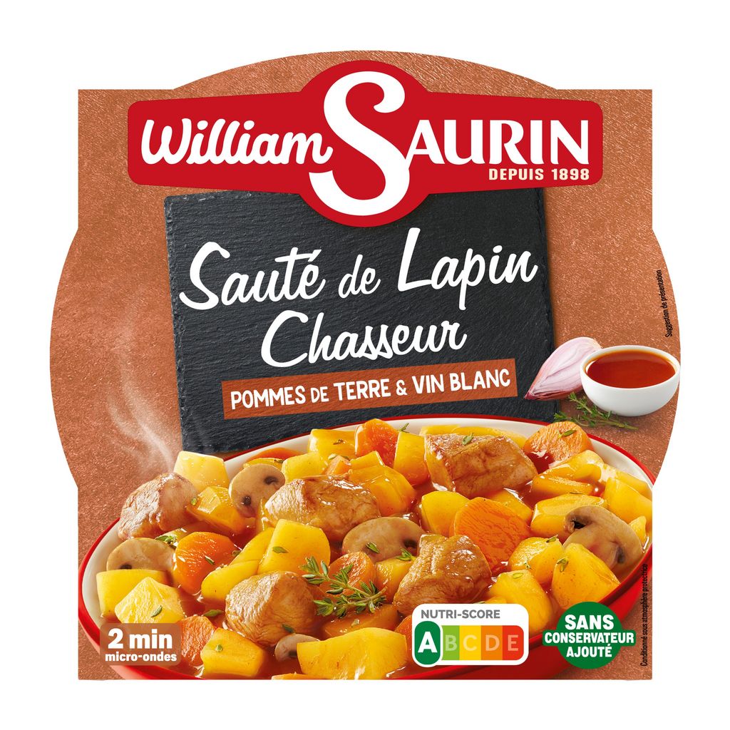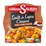 Pommes de terre précuites 31%, viande de lapin préparée en salaison précuite 26% (viande de lapin, eau, sel, stabilisant : citrate de sodium), eau, carottes 10%, champignons 4%, concentré de tomate 1%, huile de colza, plantes aromatiques (dont échalote et thym), amidon modifié, oignons déshydratés, farine de BLE, vinaigre de vin, brisures de cèpes 0,4%, arôme naturel (dont BLE), extrait de vin blanc, sel, épaississant : gomme xanthane, épice. Viande origine : Hors UE