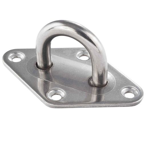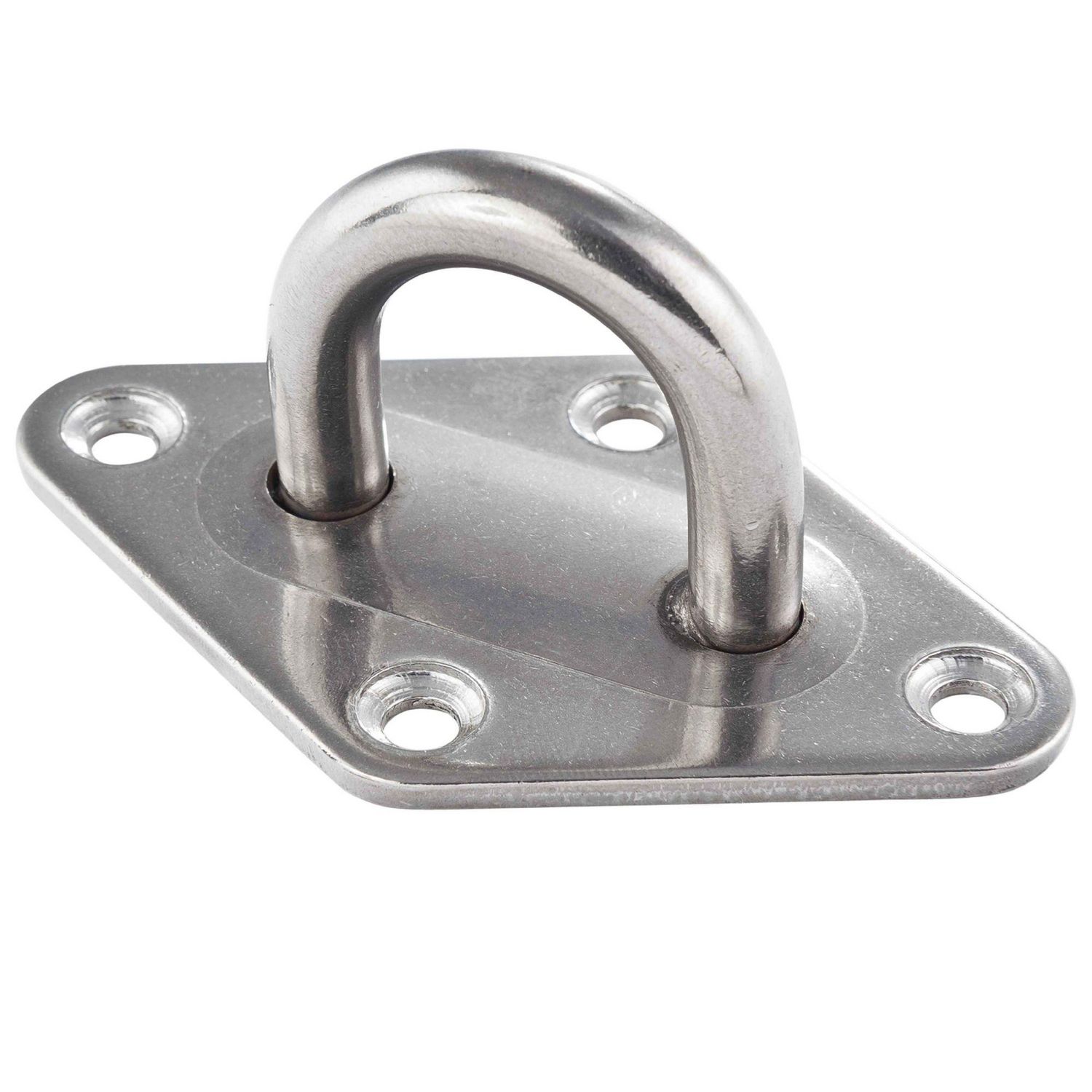 Pontet inox sur platine en forme de losange pour la fixation de voile d'ombrage et la création d'un point de fixation sur un mur. Point d'ancrage en inox résistant aux intempéries.