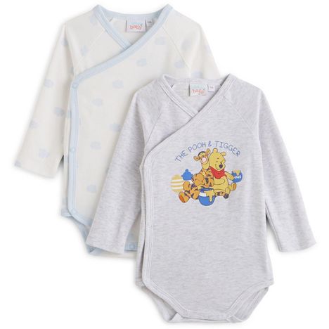 En savoir +Indispensables au confort de bébé, le body à manches longues en pur coton apporte un supplément de chaleur et de douceur. Ce lot de 2 bodies forme croisé est hyper craquant et est idéal dès la naissance : l’ouverture croisée pressionnée permet un change et un habillage facile même pour les tout petits bébés. On craque pour les motifs très tendres ! Ce lot est composé d’un body écru imprimé nuages et d’un body chiné imprimé Winnie et Tigrou.