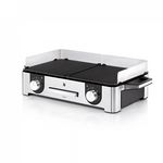 Wmf 0415280011 Le Barbecue électrique Master-Grill Lono Wmf 0415280011 en Cromargan® est idéal pour apprécier un barbecue à l'intérieur comme à l'extérieur. Avec une surface de grill de 28 x 50 cm, le Master-Grill LONO offre une large surface pour préparer des plats grillés variés et de grande taille. Il est équipé de deux plaques nervurées dont la température peut être réglée indépendamment grâce aux commandes séparées avec éclairage LED. L'élément chauffant est intégré dans les deux plaques de grill en fonte d'aluminium extra-épaisses. Non seulement le Master-Grill LONO offre une large surface de grill, mais sa puissance de 2 400 watts garantit des résultats parfaits. Le bac amovible de récupération de graisse et les deux plaques de cuisson sont lavables au lave-vaisselle. Il est également équipé d'une protection amovible contre le vent et les éclaboussures, pour son utilisation en extérieur.Les points fortsCromargan® mat - Deux plaques en fonte d'aluminium, Puissance 2400 watts, Bac à graisse amovible en Cromargan® compatible lave-vaisselle.Deux zones de cuisson contrôlables indépendantes, surface de grill : environ 28 cm x 50 cm.Réglage de température variable avec éclairage LED.Deux plaques avec revêtement antiadhésif et éléments chauffants intégrés, retrait facile des plaques de grill grâce au mécanisme de déverrouillage.Protection amovible contre le vent et les éclaboussures, certification pour l'extérieur.