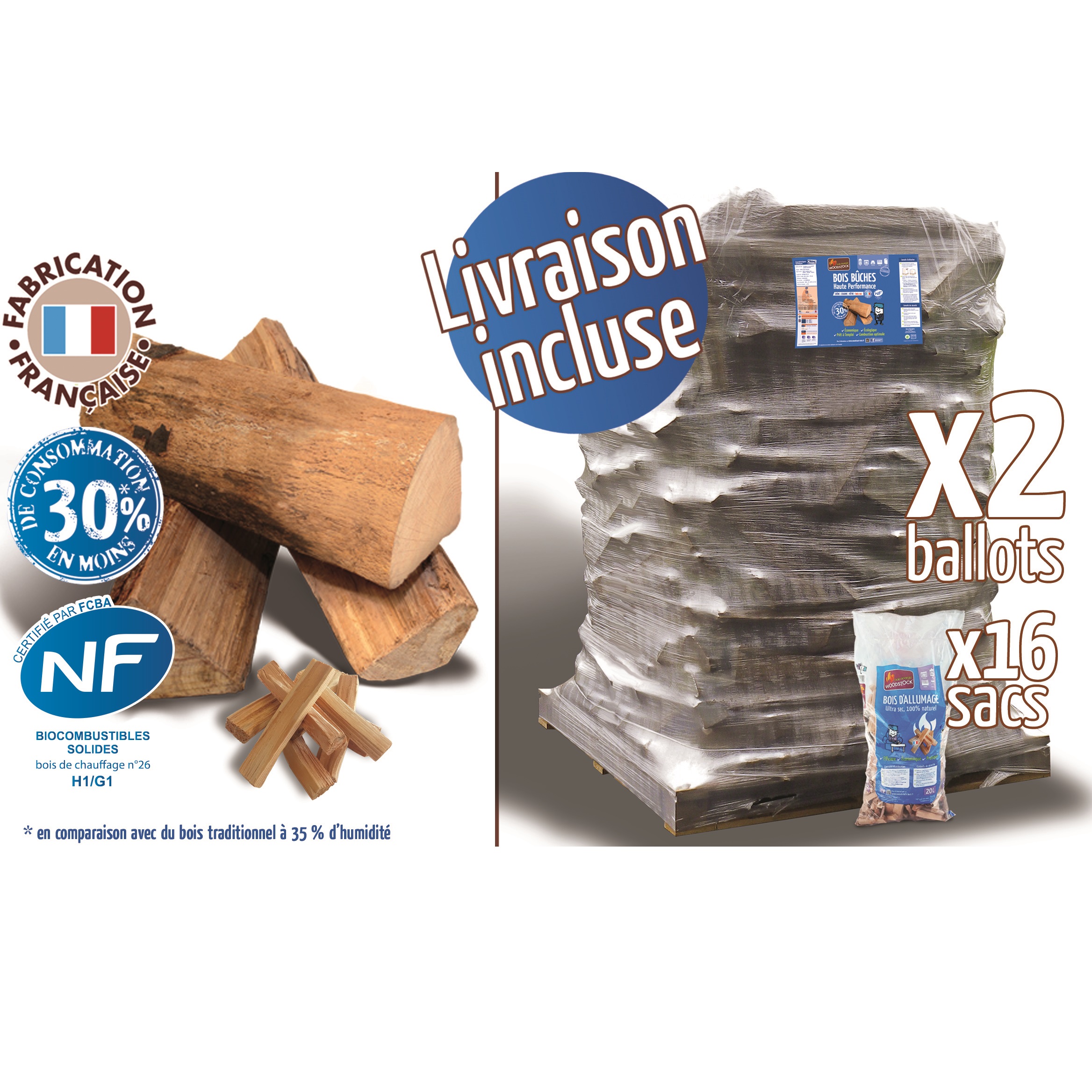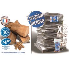 1 palette = 1 ballot de 2400 dm3 de bois en vrac + 8 sacs de 20 litres de bois d’allumage