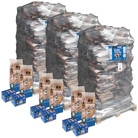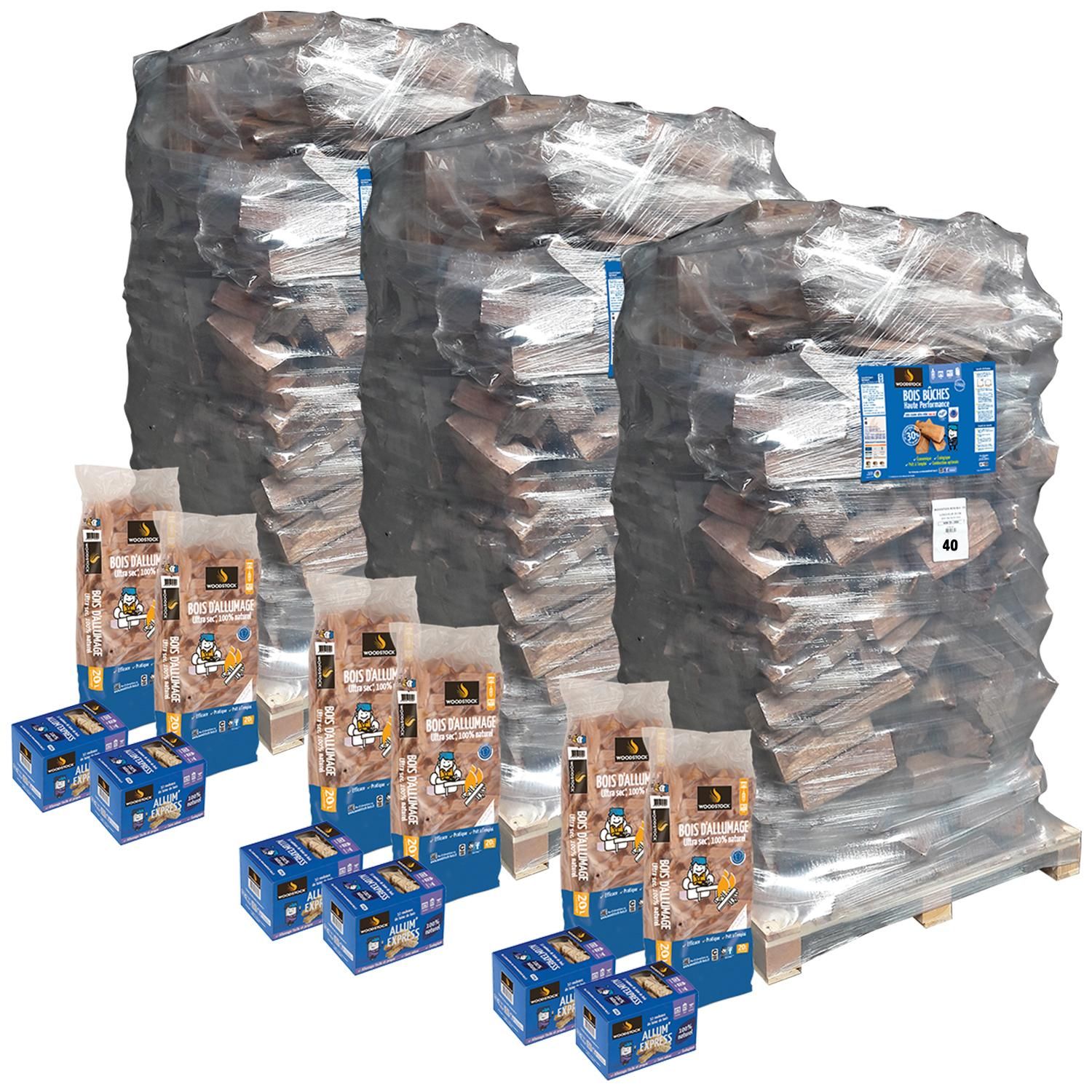 Livraison par lot de 3 palettes de 2 000 dm de bûches 40 cm + 2 sacs de bois d'allumage offert et 2 boites d'allum'express offerts. Les tarifs s'entendent livraison incluse en France Métropolitaine, hors îles et altitude supérieure à 500m : consultez nos modalités de livraisons pour plus d'informations.