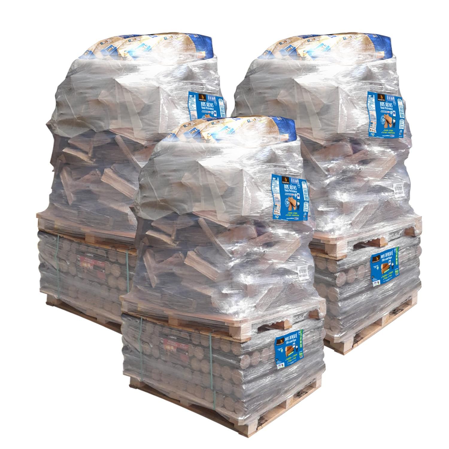 Livraison par lot de 3 palettes de 40 packs de bûches densifiées + 1 300 dm de bûches 30 cm + 2 sacs de bois d'allumage offert et 2 boites d'allum'express offerts. Les tarifs s'entendent livraison incluse en France Métropolitaine, hors îles et altitude supérieure à 500m : consultez nos modalités de livraisons pour plus d'informations.