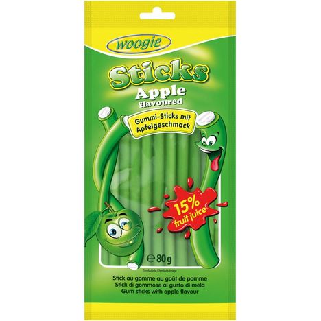 Bâtons de confiserie au goût de pomme et fourrés. 15% de jus de fruits.