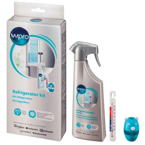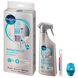 Wpro COL015 Kit Wpro COL015 pour le nettoyage des réfrigérateurs et congélateurs. Ce kit comprend un nettoyant réfrigérateur de 500 ml (nettoie et élimine les tâches et les résidus alimentaires en laissant une agréable odeur de citron), un thermomètre (plage : - 35°C à + 40°C) et un absorbeur d'odeu