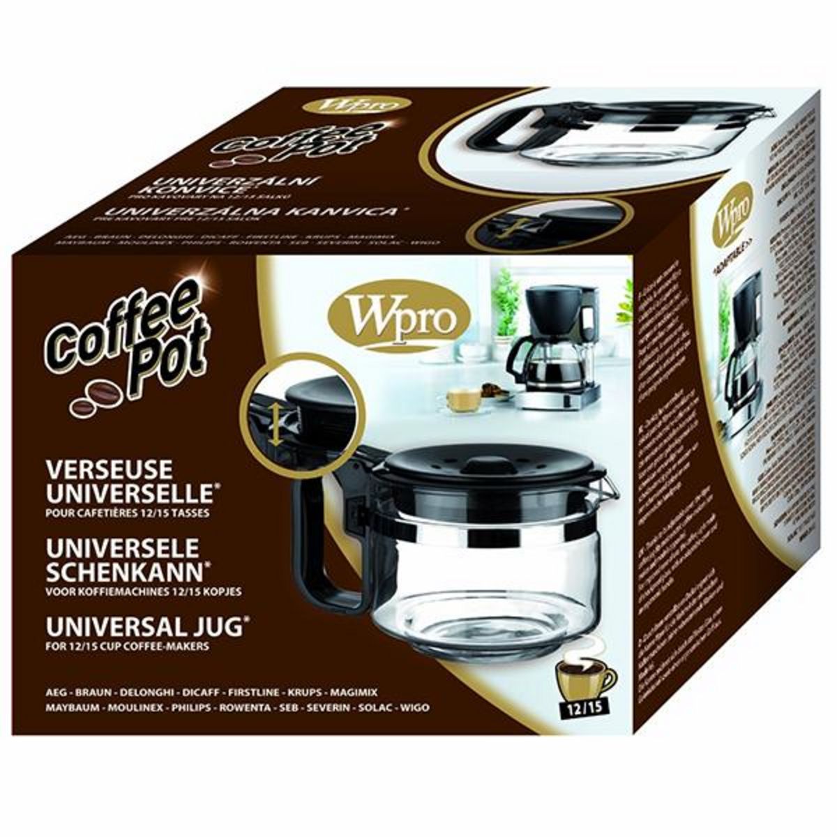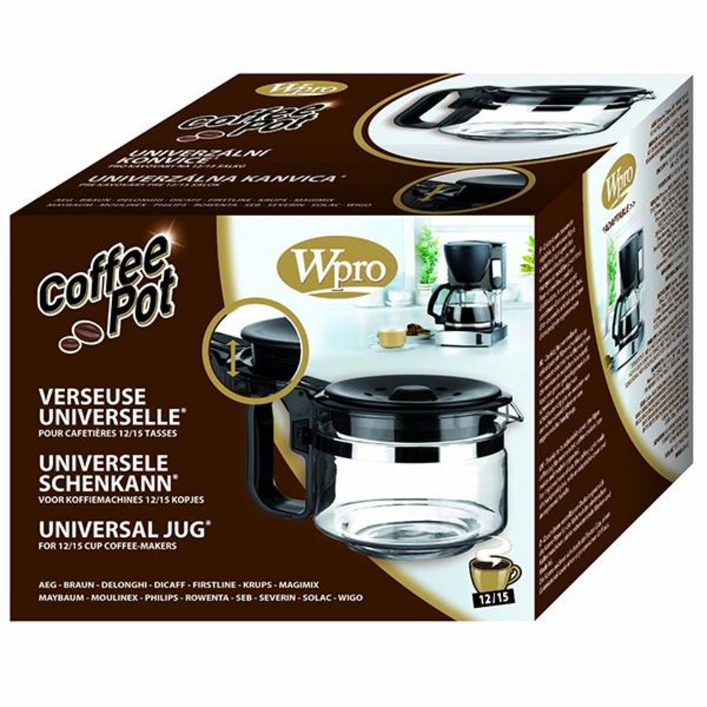 Wpro UCF100 La verseuse Wpro,pour 12 à 15 tasses,est universelle.La verseuse est résistante avec sa matière en verre antichoc. Elle est aussi ergonomique avec sa poignée et pratique avec son couvercle vissable et articulé.Elle est aussi universelle et s'adapte à la hauteur du stop-goutte de la cafet