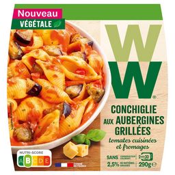 Ingrédients : conchiglie rigate cuites 34,3% (semoule de BLE dur, eau, huile de colza), eau, aubergines grillées 15,1%, courgettes grillées, LAIT entier pasteurisé, double concentré de tomates 4,8%, poivrons rouges, tomates semi déshydratées et marinées 2,5% (tomates 2,3%, huile de colza, sel, origan, ail), tomates 2,2%, EMMENTAL 1,8% (contient LAIT), FROMAGE râpé1,5% (contient LAIT), farine de BLE, condiment balsamique blanc (vinaigre de vin, moût de raisin), basilic, purée d'ail, sel, MOUTARDE de Dijon (eau, graines de MOUTARDE, vinaigre d'alcool, sel), paprika, huile de colza, zestes de citron, thym, curcuma, poivre blanc. Pâtes : origine Italie. Aubergines : origine UE. Tomates : origine UE, Maroc, Turquie. Traces possibles : poisson, crustacés, mollusques, œuf, soja, céleri.