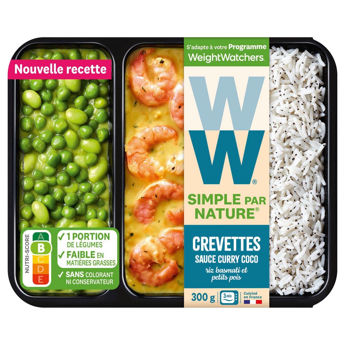 Ingrédients : riz basmati cuit 27,1% (eau, riz basmati), CREVETTE décortiquée 21,5% (CREVETTE, eau, sel), petits pois doux 17,5%, eau, fèves de SOJA 5,2%, purée de petits pois 5%, lentilles rouges 2,1% (corail), échalotes, huile de colza, LAIT écrémé en poudre, LAIT de noix de coco en poudre 0,5% [LAIT de noix de coco, maltodextrine de tapioca, caséinate de sodium (contient du lait)], sel, CREME fraîche (contient LAIT), amidon de maïs, épices curry 0,1% (curcuma, coriandre, fenouil, gingembre, cannelle, piments, anis, fenugrec, oignon, poivre, cardamome, girofle, ail), graines de pavot, ail, farine de BLE, jus de citron concentré, coriandre, épaississant : E 415, piment fort, curcuma, estragon, poivre blanc, thym. Riz : origine Pakistan, Inde. Crevette : origine non-UE. Petits pois : origine UE. Traces possible de : poisson, mollusque, œuf, moutarde, céleri.