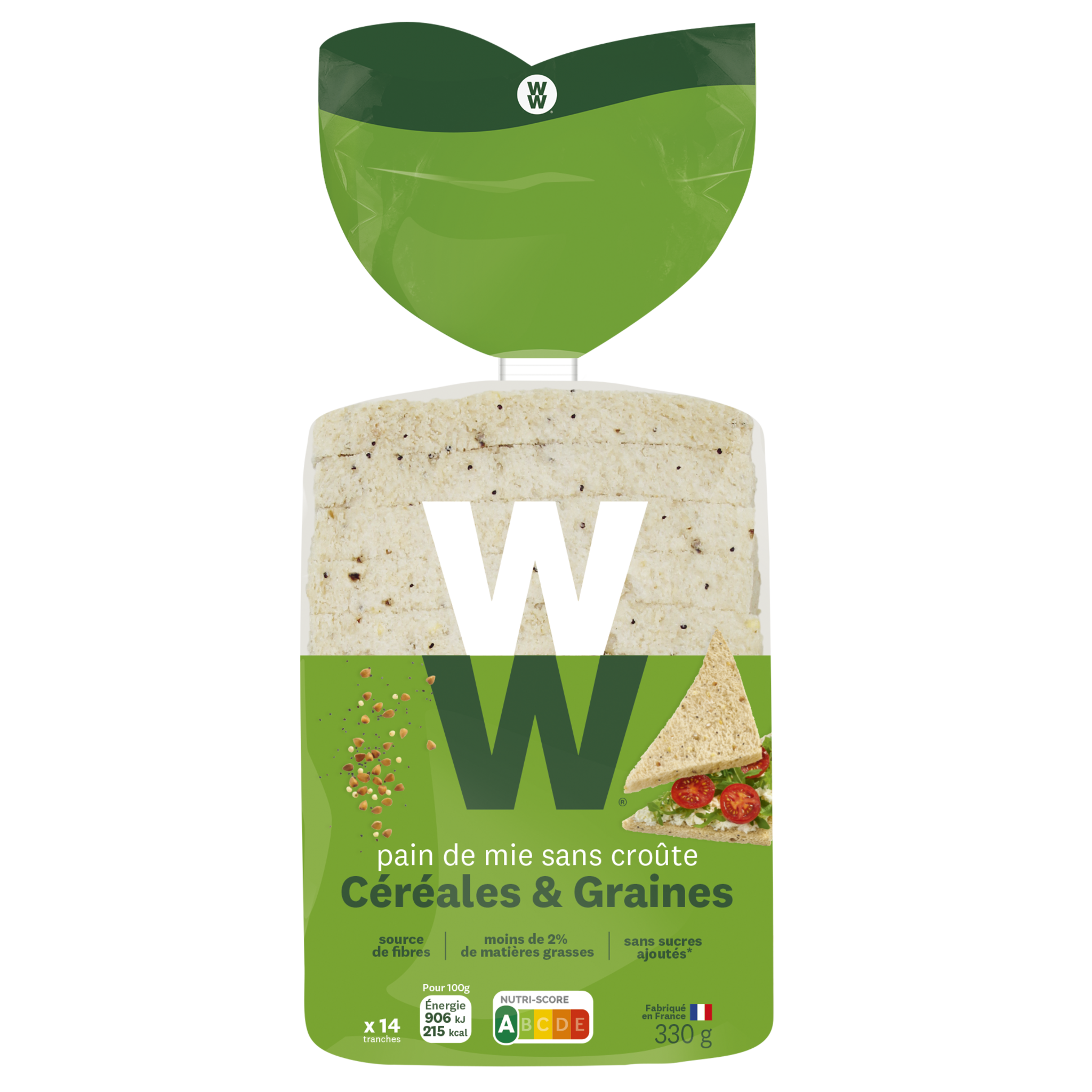 PAIN DE MIE SANS CROÛTE TRANCHÉ AUX CÉRÉALES Le pain de mie sans croûte aux céréales et graines WW associe le moelleux de sa mie au croquant des graines de millet, sarrasin et pavot. Sa recette est source de fibres, sans sucres ajoutés*, sans huile de palme** et contient moins de 2% de matières grasses. Idéal en sandwich, il peut aussi se consommer au petit-déjeuner. Le pain de mie sans croûte aux céréales et graines WW : l'allié d'une alimentation équilibrée pour se sentir bien au quotidien. *Contient uniquement les sucres naturellement présents dans les ingrédients tels que la farine ** Une recette à faible teneur en acides gras saturés