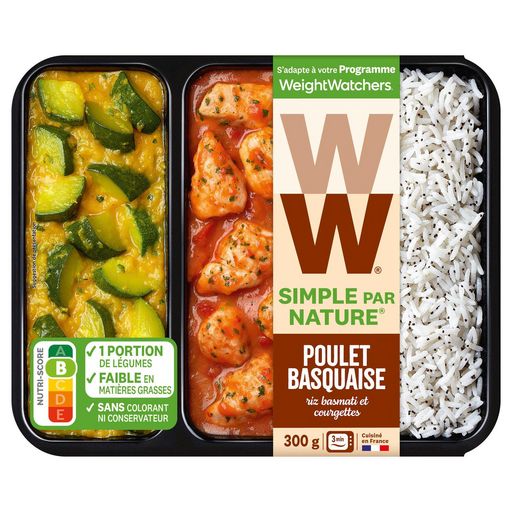 Toute la culinarité de WW dans une recette gourmande et parfumée : De généreux morceaux de poulet agrémentés d'une sauce savoureuse cuisinée à la basquaise riche en saveurs avec des tomates et des poivrons délicatement relevés de paprika. Une belle portion de riz basmati délicatement parfumé aux graines de pavot, des courgettes délicatement cuisinées à la provençale; Une recette gourmande et légère <3% de matières grasses, Nutriscore B, sans colorant, sans conservateur