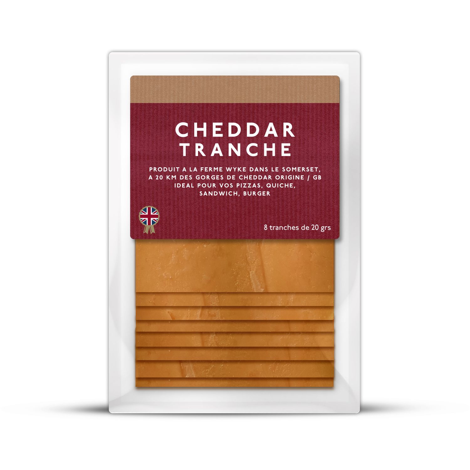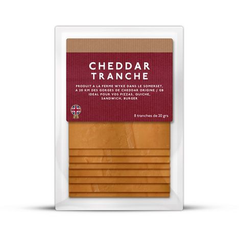 PRODUIT A LA FERME WYKE DANS LE SOMERSET, A 20 KM DES GORGES DE CHEDDAR ORIGINE / GB IDEAL POUR VOS PIZZAS, QUICHE, SANDWICH, BURGER Mature coloured cheddar,en tranches