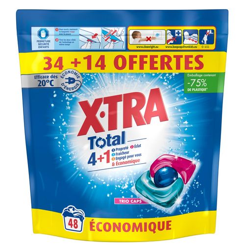 X•TRA Total 4+1 Triocaps, c'est l'efficacité d'X•TRA alliée à un détachant actif, en format capsule pour encore plus de praticité ! Découvrez la nouvelle technologie Fraîcheur MAX qui booste la fraîcheur de votre linge dès l'ouverture de la machine, toujours à prix X•TRA ! Une seule lessive pour tout votre linge, à toute température. Efficace dès 20° Sa formule vous assure un blanc lumineux et des couleurs éclatantes, lavage après lavage La lessive n°1 en France** et toujours à prix X•TRA !