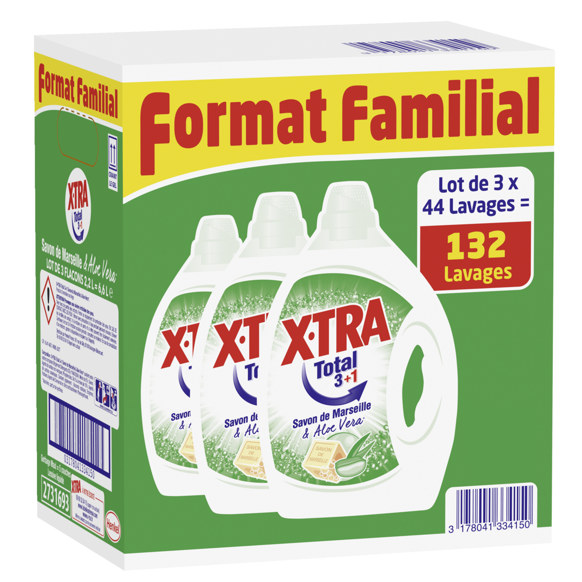 X•TRA Total+ Savon de Marseille & Aloe Vera, c'est une formule testée dermatologiquement contenant des ingrédients d'origine végétale. Pour un linge impeccable et un respect optimal des peaux de toute votre famille, toujours à prix X•TRA ! Attention. Provoque une sévère irritation des yeux. Tenir hors de portée des enfants. Porter un équipement de protection des yeux. En cas de contact avec les yeux : Rincer avec précaution à l'eau pendant plusieurs minutes. Enlever les lentilles de contact si la victime en porte et si elles peuvent être facilement enlevées. Continuer à rincer. Si l'irritation oculaire persiste : consulter un médecin. En cas de consultation d'un médecin, garder à disposition le récipient ou l'étiquette. X•TRA 3x2.2L "Format Familial" Marseille