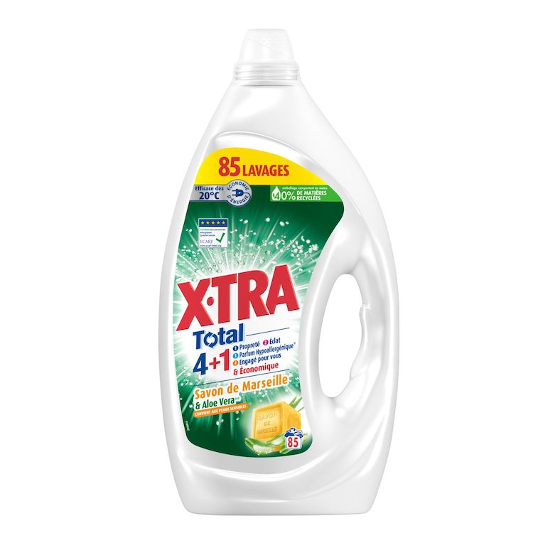 X•TRA Total 4+1 Savon de Marseille & Aloe Vera*, c'est une formule testée dermatologiquement contenant des ingrédients d'origine végétale. Pour un linge impeccable et un respect optimal des peaux de toute votre famille, toujours à prix X•TRA ! Formule développée avec des dermatologues. Efficace même à froid. Toujours à prix X•TRA ! Bouteille recyclable
