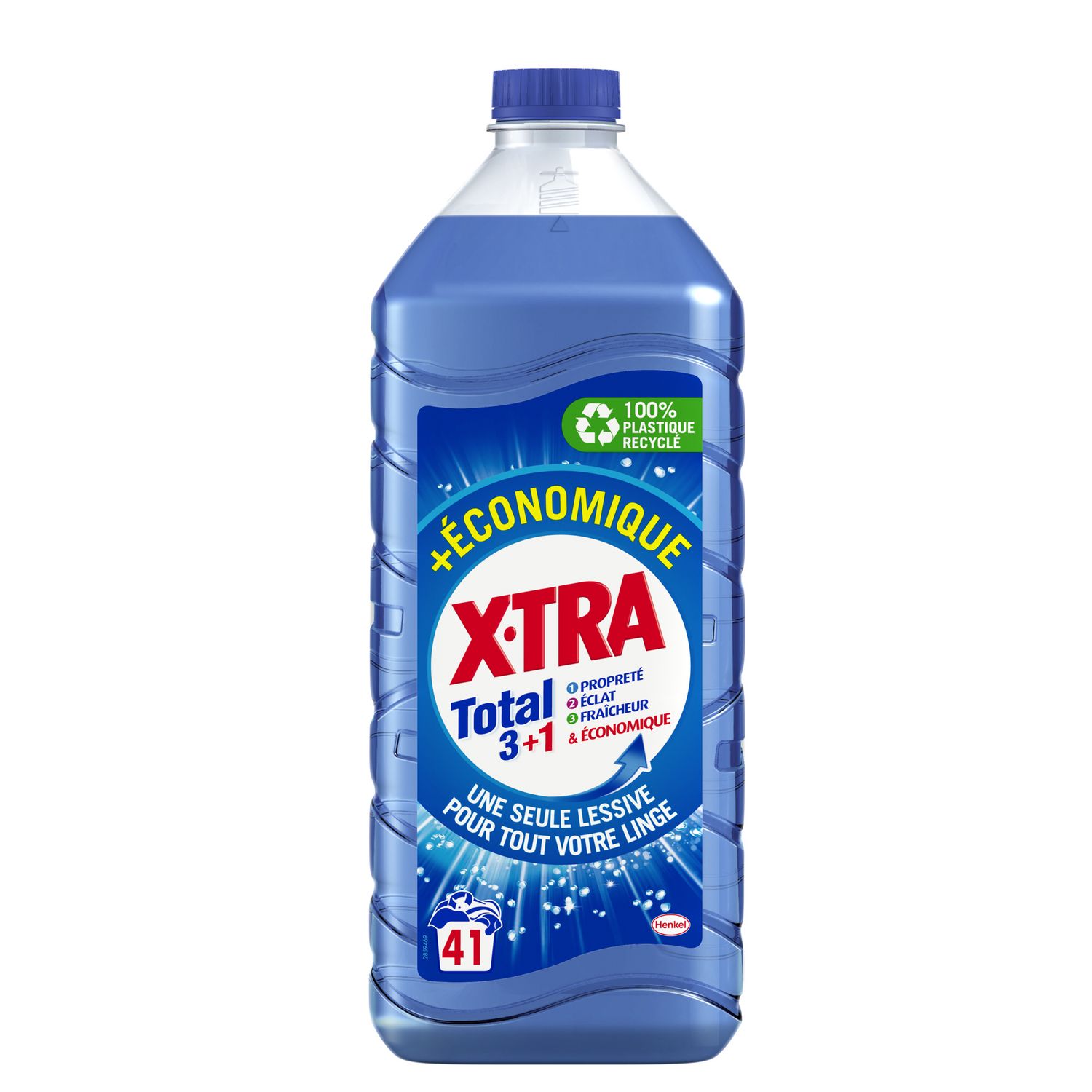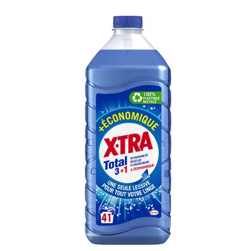 La formule X•TRA Total 3+1 est efficace dès 20° pour un linge impeccable et frais.X•TRA Total 3+1 : c'est une lessive efficace pour tout votre linge.Bouteille recyclablePour un linge impeccable, toujours à prix X•TRA !