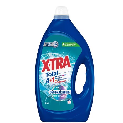 X•TRA Total 4+1 Déo Fraîcheur+ Givré offre un vent de fraîcheur à votre linge, tout en combattant les mauvaises odeurs. Sa formule permet un résultat impeccable, lavage après lavage, pour un blanc lumineux et des couleurs éclatantes. Pour un linge impeccable, toujours à prix X•TRA ! Une seule lessive pour tout votre linge, à toute température. Efficace même à froid. Toujours à prix X•TRA ! Bouteille recyclable