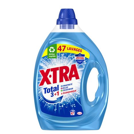 X•TRA Total 3+1, la lessive n°1 en France !*# Une seule lessive pour tout votre linge, à toute température.# Efficace même à froid.# Toujours à prix X•TRA !# Bouteille recyclable