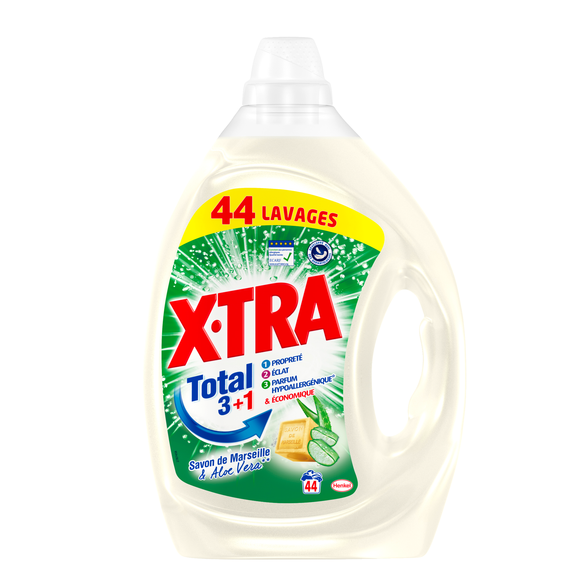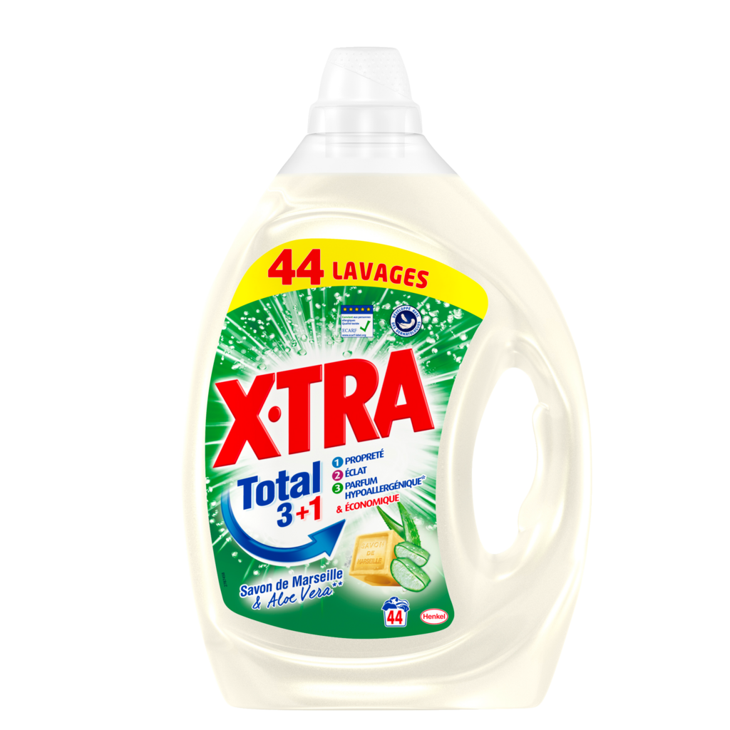 XTRA Marseille 2.2L X•TRA Total+ Savon de Marseille & Aloe Vera, c'est une formule testée dermatologiquement contenant des ingrédients d'origine végétale. Pour un linge impeccable et un respect optimal des peaux de toute votre famille, toujours à prix X•TRA ! Attention. Provoque une sévère irritation des yeux. Tenir hors de portée des enfants. Porter un équipement de protection des yeux. En cas de contact avec les yeux : Rincer avec précaution à l'eau pendant plusieurs minutes. Enlever les lentilles de contact si la victime en porte et si elles peuvent être facilement enlevées. Continuer à rincer. Si l'irritation oculaire persiste : consulter un médecin. En cas de consultation d'un médecin, garder à disposition le récipient ou l'étiquette.