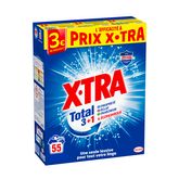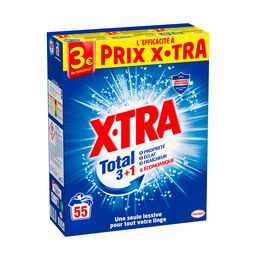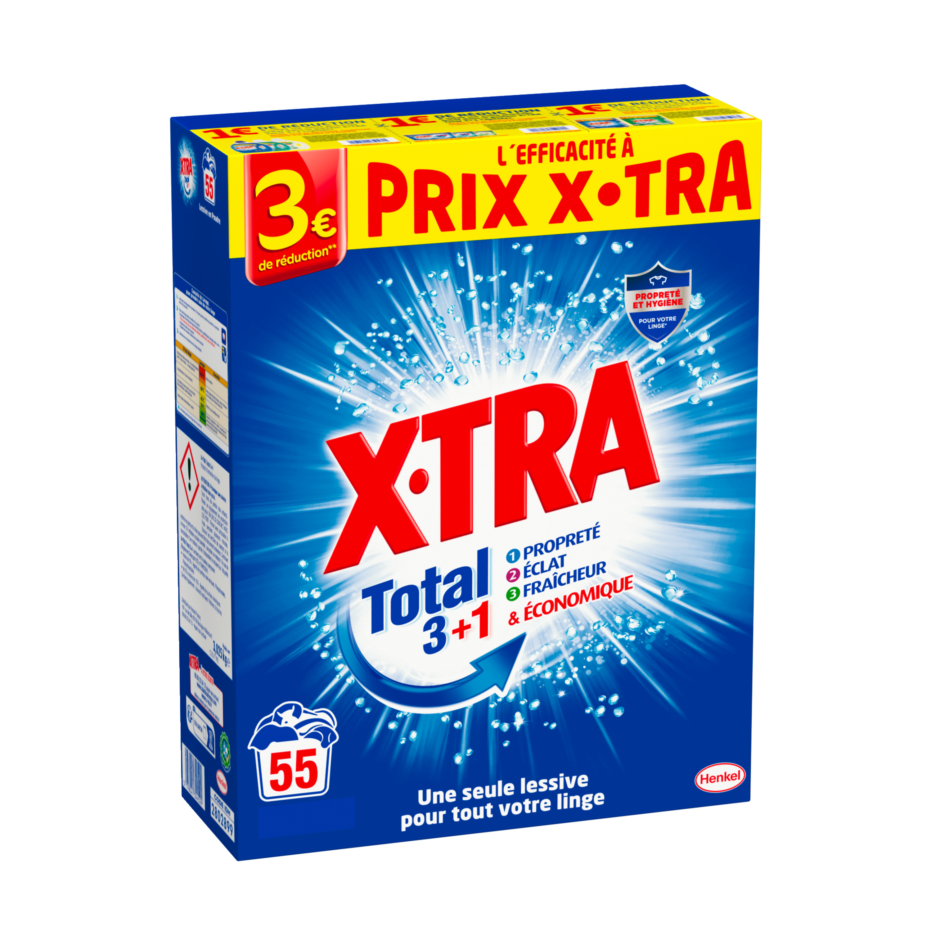 XTRA Total, c'est une seule lessive pour tous les textiles, à toute température. Sa formule vous assure un blanc lumineux et des couleurs éclatantes, lavage après lavage. Pour un linge impeccable, toujours à prix X tra ! *