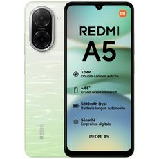 Plongez au cœur de l'action avec ce smartphone vert XIAOMI Redmi A5 offrant un écran de 6.88 pouces et une résolution de 1640 x 720 pixels. Son processeur 16 cœurs et ses 3 Go de RAM garantissent une performance optimale. Immortalisez vos moments préférés avec son double capteur photo de 32MP. Batterie de 5200 mAh pour une autonomie prolongée. Résistant à la poussière et à l'eau.