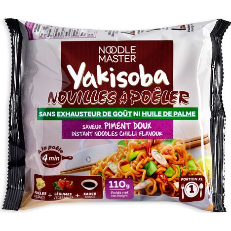 préparation alimentaire à base de blé tendre pour nouilles sautées et sachet d’assaisonnement saveur piment doux NOUVELLE RECETTE, SANS EXHAUSTEURS DE GOUT ET SANS HUILE DE PALME Des nouilles asiatiques aux saveurs uniques ! Les Yakisoba sont des nouilles de blé sautées, très populaires en Asie et faciles à préparer, qui s'accompagnent d’une sauce goûteuse pour une experience culinaire très exotique ! Des nouilles Yakisoba qui vous étonneront, grâce à leur saveur intense et légèrement relevée !