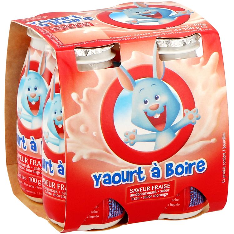 Yaourt à boire sucré saveur fraise, source de calcium et de vitamine D.