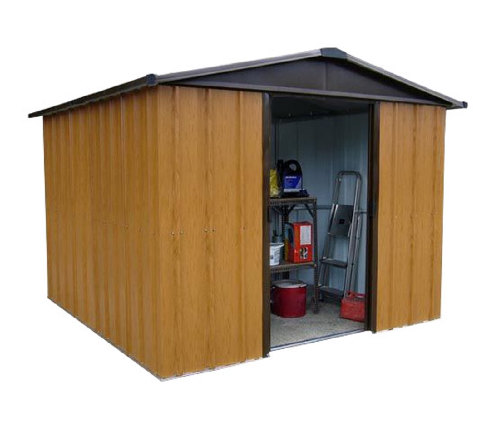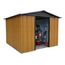 Abri de jardin YARDMASTER en métal galvanisé de surface hors tout 12,00m² ( Lxl xh) : 303 x 396 x 212 cm et de surface utile 10,76m² ( Lxl) : 281 x 383, coloris imitation bois et marron. Deux portes coulissantes intérieures. Dimensions des portes : L 120x H168 cm , hauteur des murs : 170cm. Bords des panneaux pliés pour plus de sécurité. Vis inox anti-rouille. Kit d'ancrage inclus.