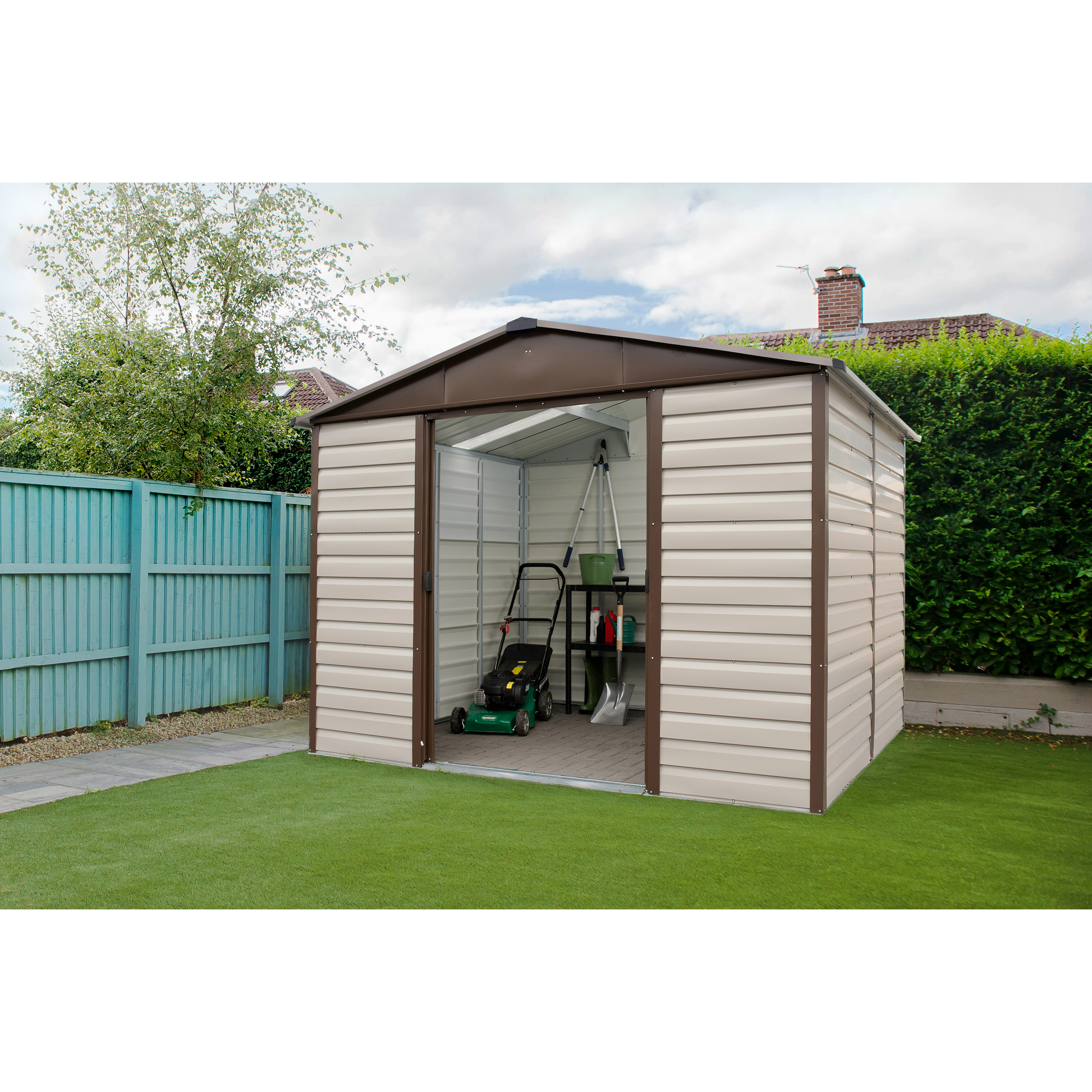 Abri de jardin YARDMASTER en métal galvanisé de surface hors tout 4,79m² ( Lxl xh) : 243 x 197 x 215 cm et de surface utile 4,04m² ( Lxl) : 222 x 182, coloris beige et marron. Deux portes coulissantes intérieures. Dimensions des portes : L 101x H178 cm , hauteur des murs : 180cm. Bords des panneaux pliés pour plus de sécurité. Vis inox anti-rouille. Kit d'ancrage inclus.