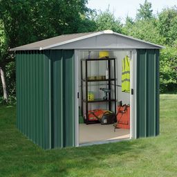 Abri de jardin YARDMASTER en métal galvanisé, surface hors tout 5,25m² ( Lxl xh) : 242 x 217 x 193 cm, surface utile 4,51m² ( Lxl) : 222 x 203, Coloris vert et alu. Deux portes coulissantes intérieures. Dimensions des portes : L101 x H158 cm , hauteur des murs : 160cm. Bords des panneaux pliés pour plus de sécurité. Vis inox anti-rouille. Kit d'ancrage inclus.