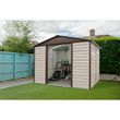 Abri de jardin YARDMASTER en métal galvanisé surface hors tout 7,18m² ( Lxl xh) : 303 x 237 x 224 cm et de surface utile 6,24m² ( Lxl) : 281 x 222, coloris beige et marron 2 portes coulissantes intérieures. Dimensions des portes : L 120x H178 cm , hauteur des murs : 180cm. Bords des panneaux pliés pour plus de sécurité. Vis inox anti-rouille. Kit d'ancrage inclus.