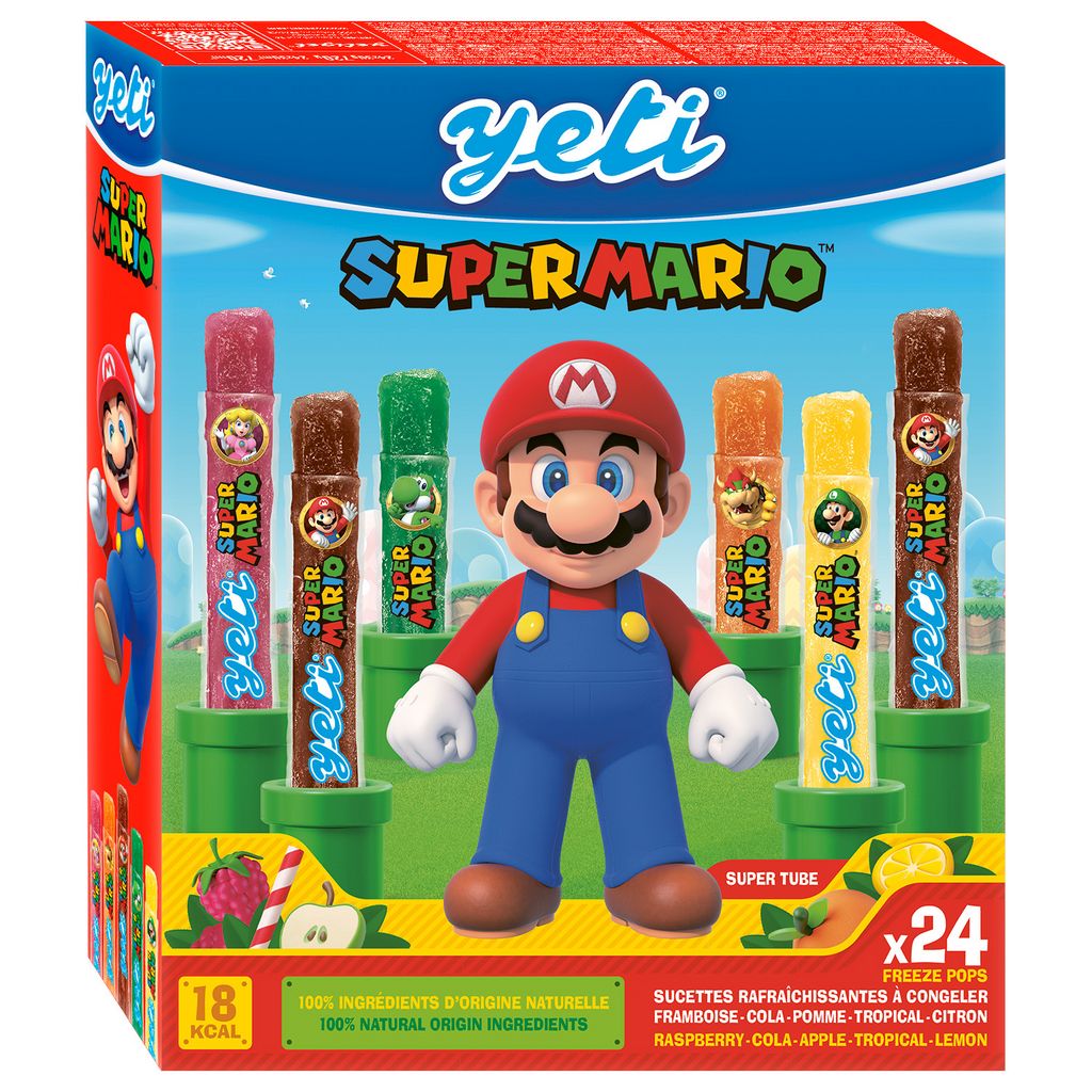 Yeti® n’a pas pu s’empêcher de givrer les tubes de voyage de Super Mario® ! Retrouvez les inimitables tubes Yéti®, à congeler chez soi, dans une boite généreuse de 24 glaces à partager (ou à garder rien que pour soi!) aux couleurs de Super Mario et de ses amis! Que ce soit au cola pour Mario, au citron pour Luigi, à la framboise pour Peach, à la pomme pour Yoshi ou aux fruits tropicaux pour Bowser, le tube Yeti® Super Mario® assure une aventure gourmande ultra-rafraichissante fun et saine, avec des glaces peu caloriques avec 100% d'ingrédients d'origine naturelle !