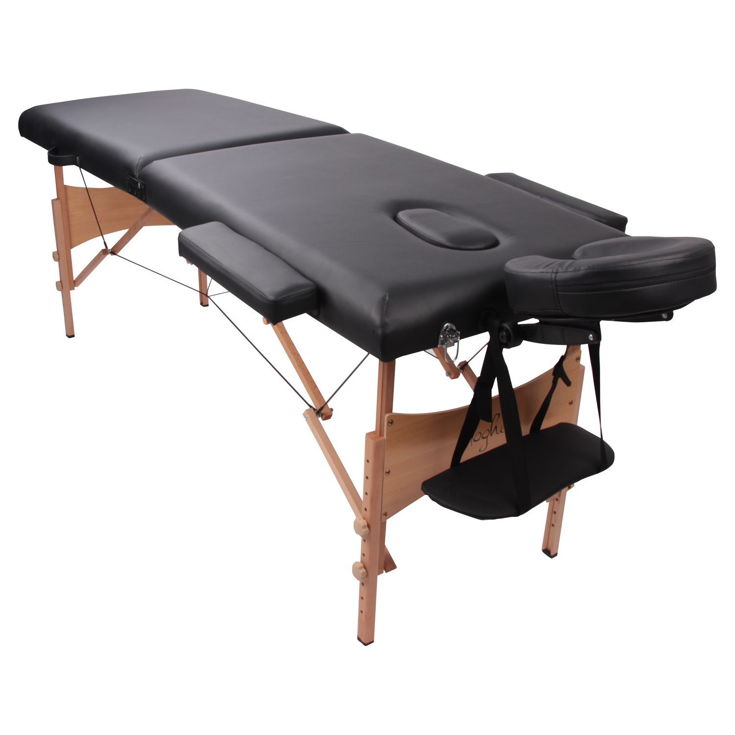 Les câbles métalliques sont recouverts de plastique pour une stabilité maximale. Pour votre sécurité, une stabilité accrue est assurée grâce à des pieds en bois massif hêtre anti-dérapants. Le poids maximum par utilisateur est de 125 kg et la charge de travail maximum est de 225 kg répartis.La dimension (L×P×H) de la table est de 215 × 80.5 ×(62-84.5) cm. La dimensions de la surface de couchage (L×P) est de 185 × 60 cm.