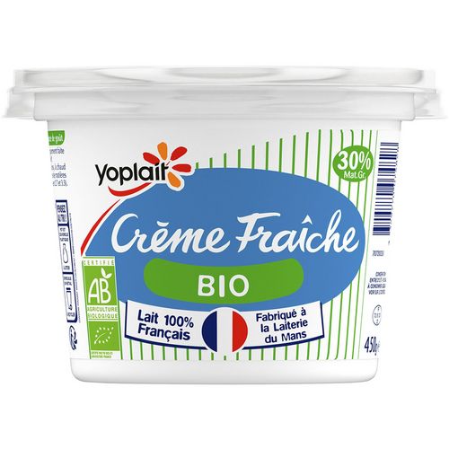 Crème fraîche bio 30% de matières grasses La Crème Fraiche Bio Epaisse de Yoplait c’est un ingrédient de choix au lait d’origine France pour sublimer vos plats et préparations à chaud ou à froid.