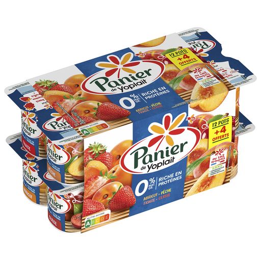 Panier de Yoplait 0%, c'est un dessert onctueux et des bons fruits, avec 0% de matière grasse. Panier de Yoplait c'est : • 100% de lait de nos régions • 100% de morceaux de fruits mis en œuvre dans nos recettes • 100% de notre production provient de nos laiteries du Mans ou de Vienne • Sans conservateur, ni colorant et arômes artificiels Notre engagement ne s'arrête pas là. Nous nous efforçons à réduire notre empreinte carbone en : • Réduisant le plastique de 13% sur nos pots depuis 10 ans • Utilisant que du carton 100% recyclé