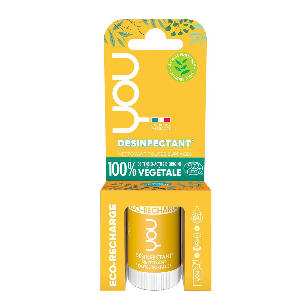 Le Nettoyant Désinfectant YOU c’est aussi moins d’emballage gaspillé ! Grâce à son système de recharge ultra-concentrée, offrez au moins 10 vies supplémentaires à votre spray Nettoyant Désinfectant YOU. Economique et pratique : la recharge YOU du spray Nettoyant Désinfectant est légère (30 grammes), facile à transporter et à stocker.