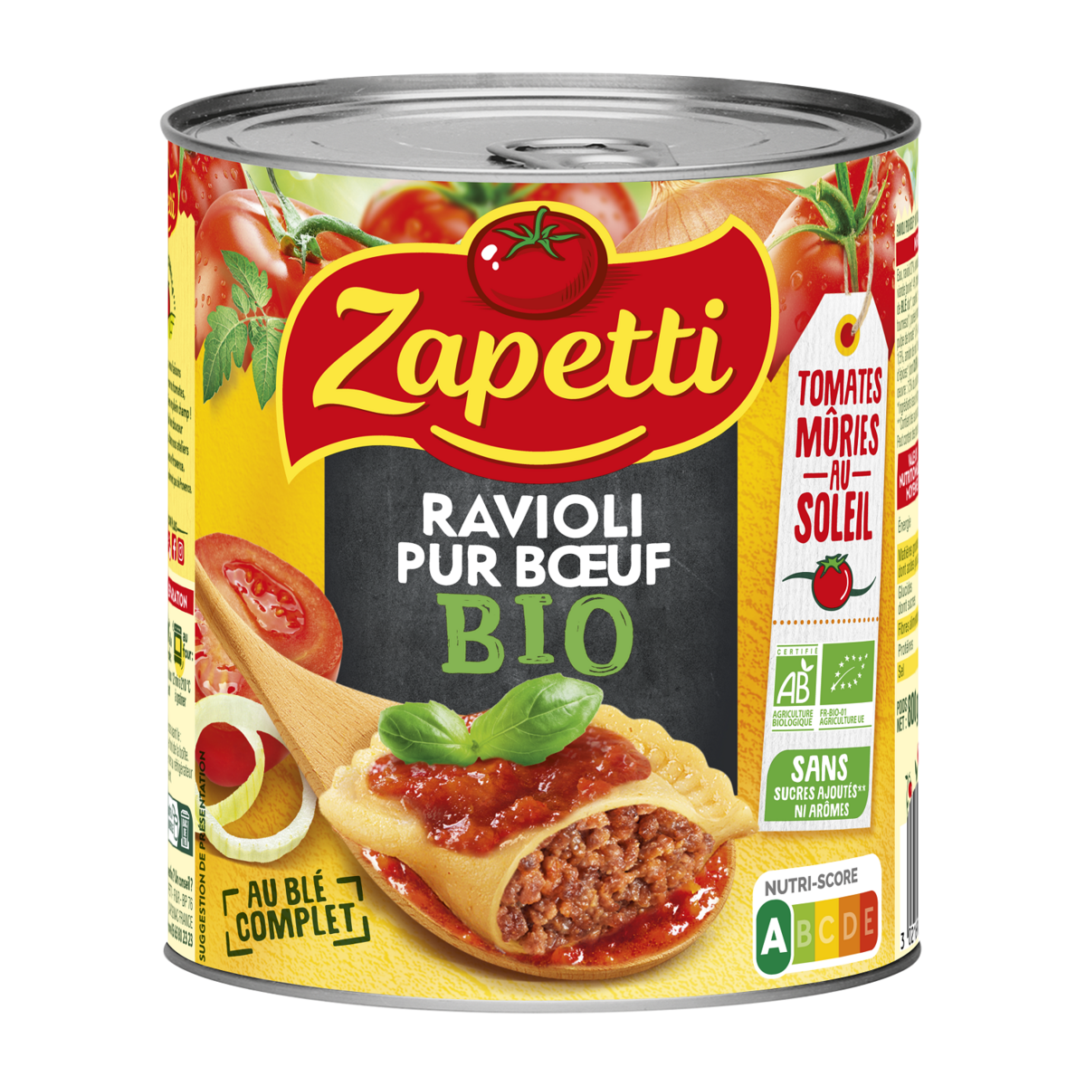 Zapetti s'engage pour le BIO et lance un ravioli pur boeuf BIO avec pâte au blé complet, sans conservateur, sans sucres ajoutés et sans colorant pour un repas complet, sain et nutritionellement équilibré.Nutriscore A Ravioli pur bœuf* bio et sauce à la tomate et au bœuf* bio, *avec arômes naturels.
