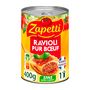 Eau, ravioli 27 % (semoule de BLÉ dur 14%, eau, viande de bœuf, chapelure (dont GLUTEN), carotte, sel, oignons 0,1 %, huile de colza), concentré de tomates 15 %, oignons 3,5%, viande de bœuf, sel, amidon, plante aromatique. Viande de bœuf origine France mise en oeuvre : 7,5% du poids net total.