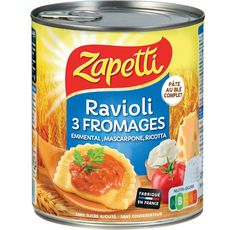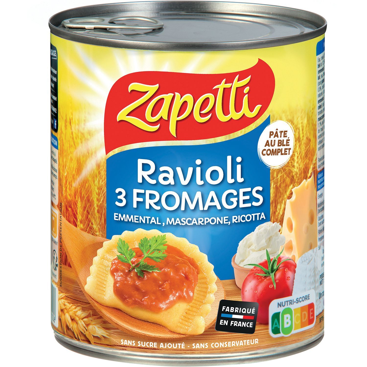 Raviolis aux 3 fromages* et sauce tomate aux fromages*, *avec arômes naturels Une recette adaptée au régime végétarien.Zapetti s'engage avec un ravioli sans conservateur, sans sucres ajoutés et sans colorant.Pâte fraîche au blé complet pétrie par nos soins.Nutriscore B