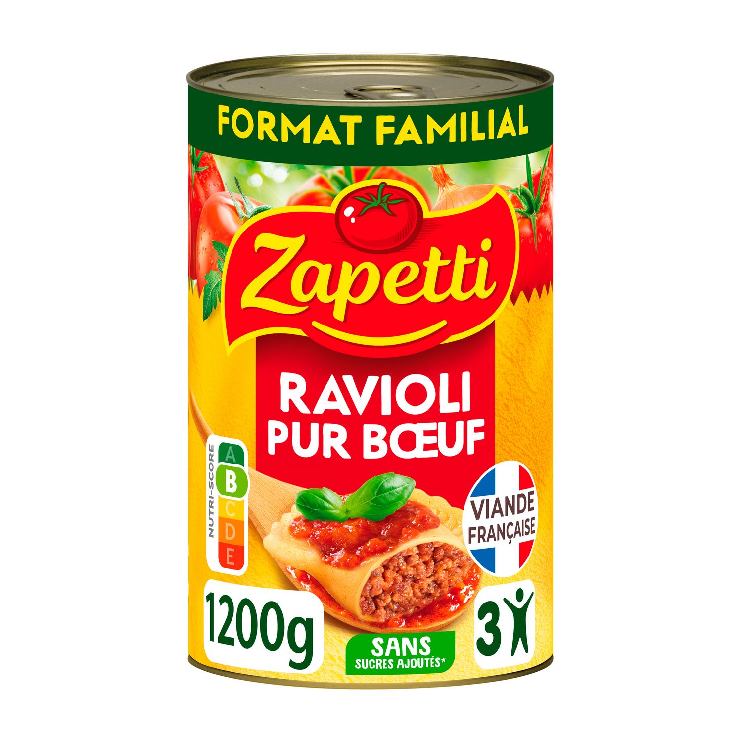 Eau, ravioli 27 % (semoule de BLÉ dur 14%, eau, viande de bœuf, chapelure (dont GLUTEN), carotte, sel, oignons 0,1 %, huile de colza), concentré de tomates 15 %, oignons 3,5%, viande de bœuf, sel, amidon, plante aromatique. Viande de bœuf origine France mise en oeuvre : 7,5% du poids net total.