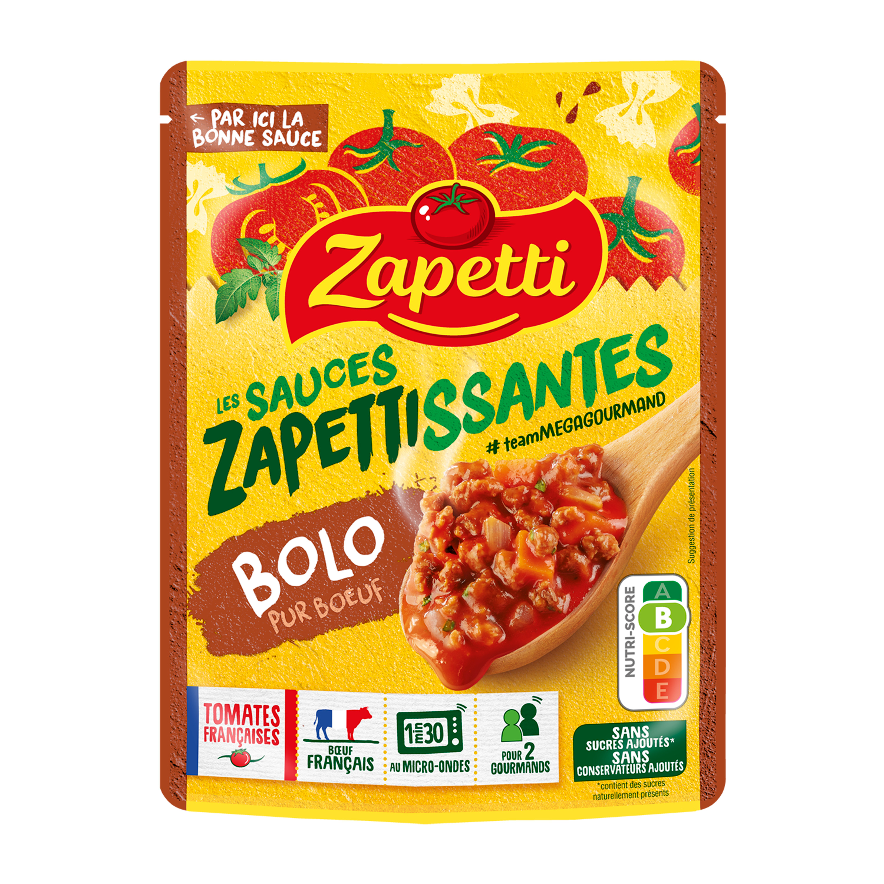 Face avant : Par ici la bonne sauce Les Sauces Zapettissantes #teamGROSMORCEAUX Bolo Pur Bœuf Suggestion de présentation Arrière : Prêts à rejoindre la #teamGROSMORCEAUX ? Ne faites pas patienter plus longtemps cet estomac qui gargouille et savourez notre bolo et ses gros morceaux de bœuf ! Pour 2 gourmands, c'est facile ! Comptez 200g de pâtes sèches pour un sachet sauce. Pour en savoir plus : zapetti.fr Logo FB Logo Instagram Chez Zapetti, on ne fait JAMAIS les choses à moitié ! Notre recette est extra généreuse mais surtout cuisinée : Avec des tomates & du bœuf 100% français Sans Sucres Ajoutés* *Contient des sucres naturellement présents Sans Conservateur ajoutés Un sachet avec de GROS avantages : Ouverture FACILE À emmener PARTOUT: à la pause déjeuner ou pour les fringales de fin de soirée