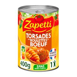 Eau, purée de tomate mi-réduite 12 %, torsades 11 % (semoule de BLE dur, poudre de blanc d'OEUF), boulettes de bœuf précuites 10 % (viande bovine (48 % de la boulette de bœuf), protéines de BLE texturées (protéines de BLE, farine de BLE), viande de dinde, blanc d'OEUF, chapelure (farine de BLE, sel), oignon 0,5%, épices, amidon, fibre de pois), pulpe de tomate avec morceaux 3,9 %, carotte, amidon, oignon 1%, sel, basilic, huile de colza, plante aromatique, épice. Traces éventuelles de : lait, céleri.